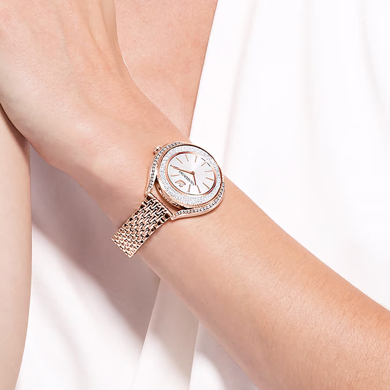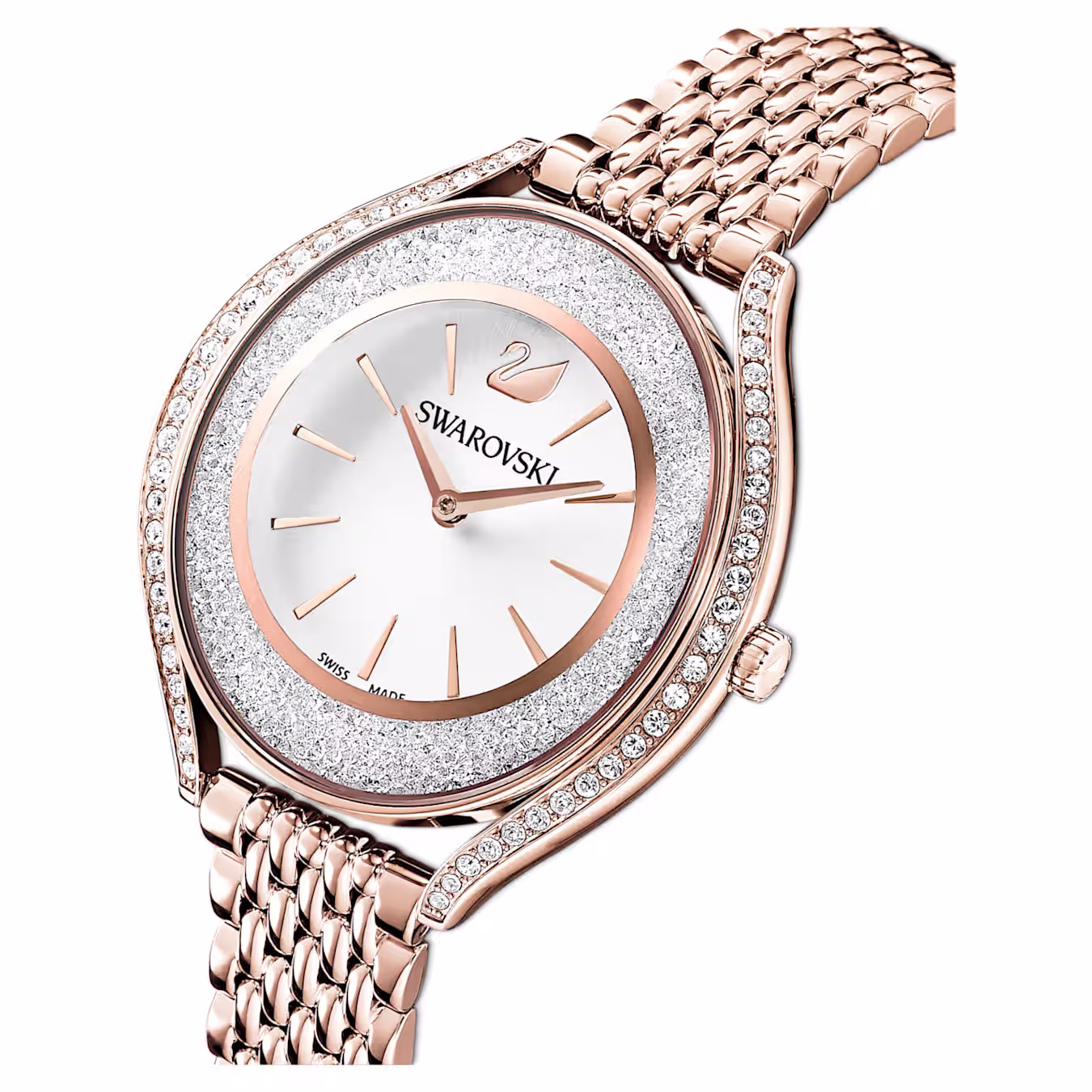 Eminently elegant: This Swarovski watch from our Crystalline Collection artfully combines form and function. More than 1,300 crystals in the rose-gold tone PVD case create a brilliant sparkling effect. A rose-gold tone PVD bracelet and a white silver tone dial with the Swarovski swan at 12 o’clock complete the sophisticated design. This Swiss made watch is water resistant up to 50 m.