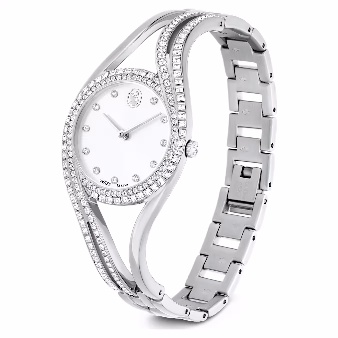Distinguished by elegant curves and a sense of refinement, this Hyperbola bangle watch blurs the line between jewellery and timepiece. The 28mm stainless steel case features a combined bezel and bracelet set with 176 clear crystals in princess and round cuts. The sunray dial also displays 11 hour markers made with crystals, along with a Swan logo at 12 o’clock. For a beautiful finishing touch, this Swiss Made watch includes a single crystal set within the crown, while offering a water resistance of 50m. It’s a modern timepiece choice that combines artistry with impeccable savoir-faire.